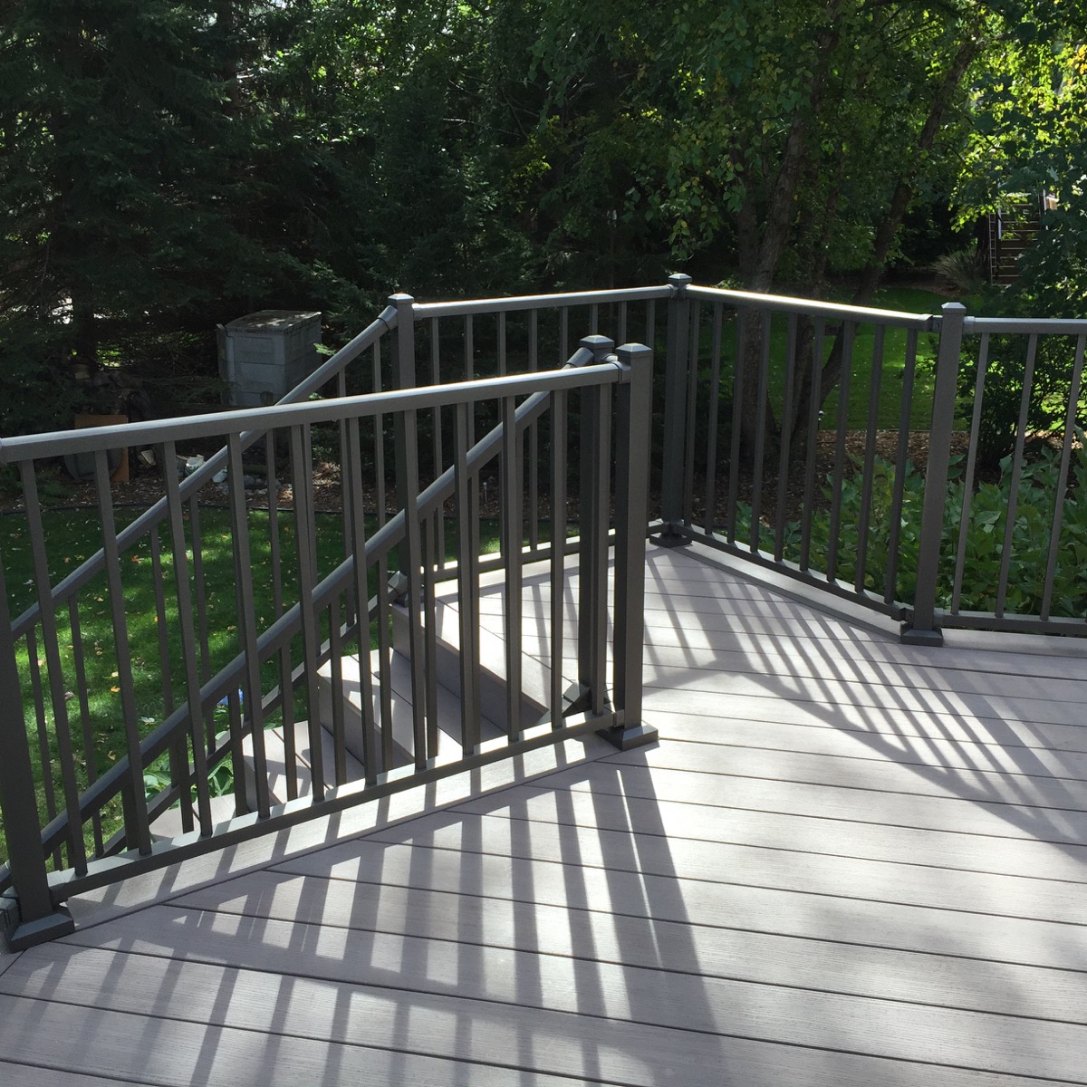 element often used in more complex-shaped decks, diagonal stairs look